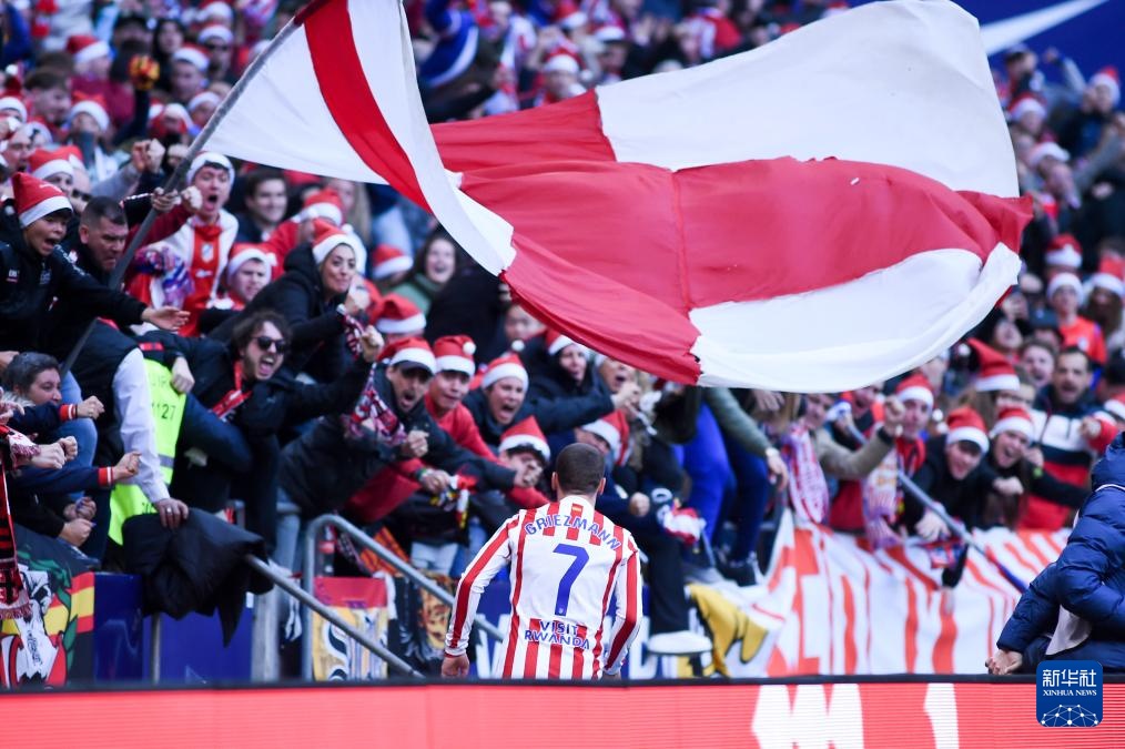 12月13日,马德里竞技队球员格列兹曼(下)庆祝进球。