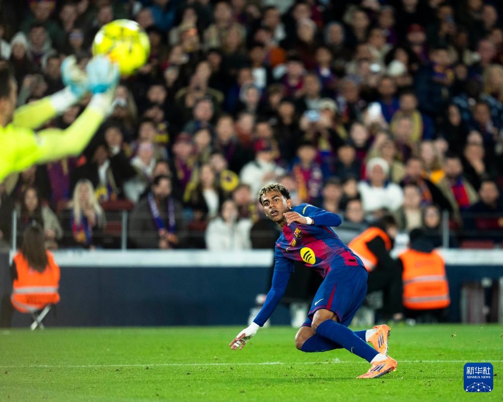 12月13日,巴塞罗那队球员亚马尔在比赛中射门。
