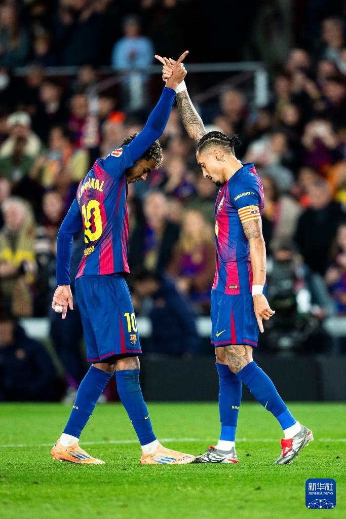 12月13日,巴塞罗那队球员亚马尔(左)与队友拉菲尼亚庆祝进球。