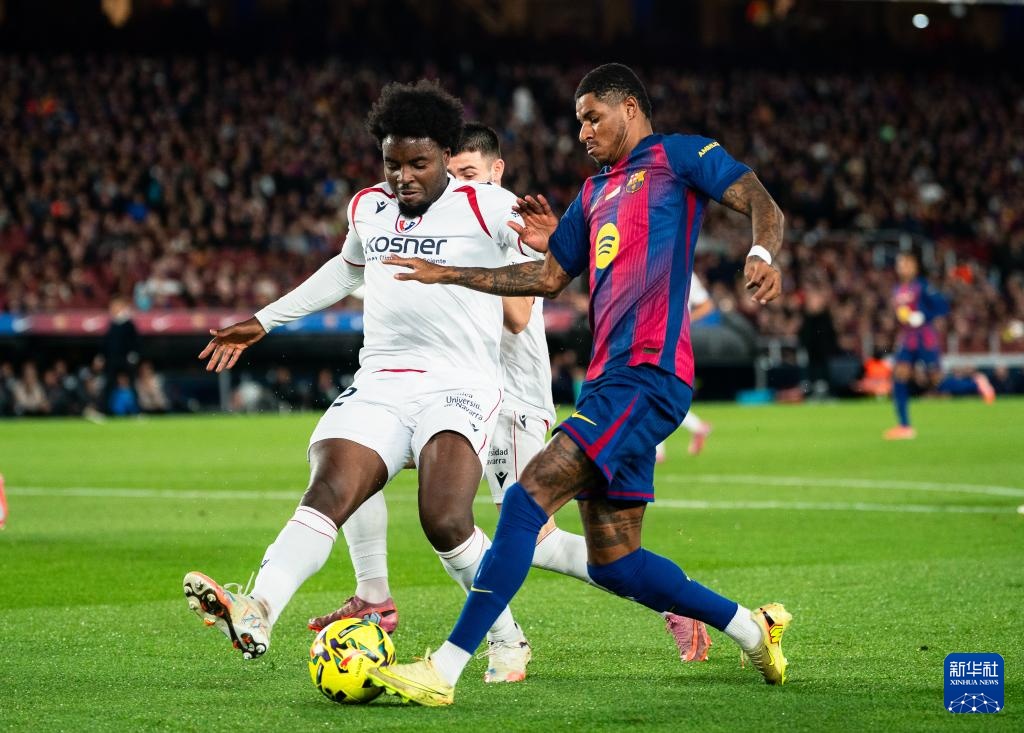 12月13日,巴塞罗那队球员拉什福德(右)与奥萨苏纳队球员恩佐·博约莫拼抢。