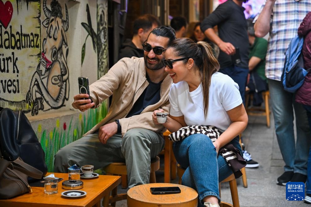 11月22日,顾客在土耳其伊斯坦布尔的曼达巴特马兹咖啡店外合影。新华社记者 刘磊 摄