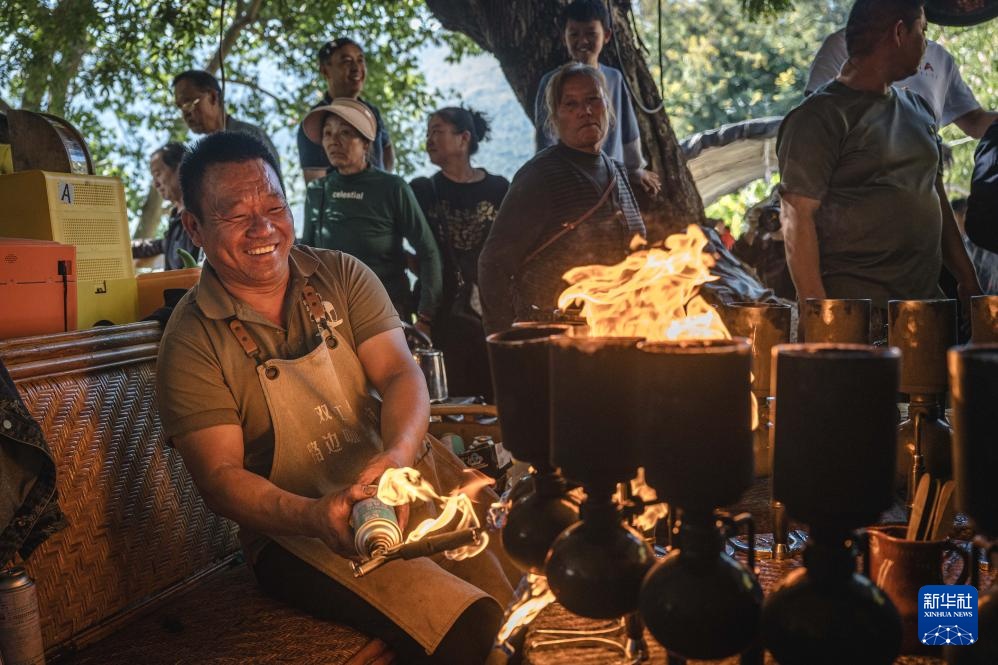 11月15日,在云南省保山市隆阳区芒宽乡的“路边咖啡馆”,游客观看李金合制作“火烧咖啡”。新华社记者 高咏薇 摄