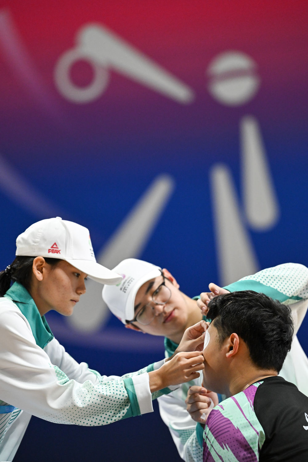 12月10日,裁判和志愿者在男子个人重剑C级金牌赛前帮助广东一团选手钟英杰(左)和罗兴东固定轮椅。新华社记者 侯俊 摄