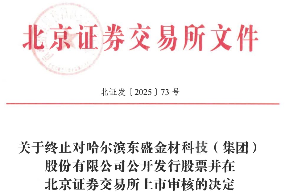 据北交所网站12月12日公告显示,北交所决定终止哈尔滨东盛金材科技(集团)股份有限公司(以下简称“东盛金材”)首次公开发行股票并在北京证券交易所上市审核。