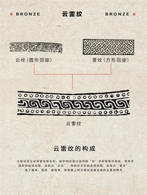作圆形连续构图的“云纹”和作方形连续构图的“雷纹”,组合在一起称为“云雷纹”,是青铜器上最常见的几何纹样,盛行于商代至西周。