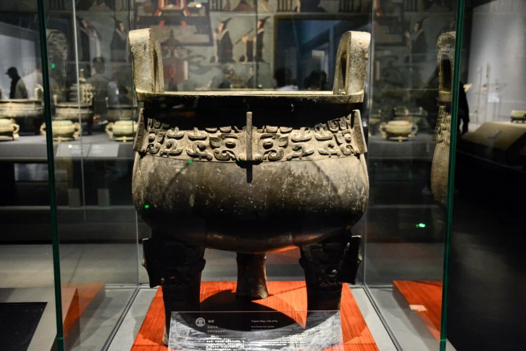 旟【yú】鼎 西周早期。1972年出土于宝鸡眉县杨家村。旟鼎高77厘米,重78.5千克,属于西周早期常见的立耳兽首垂腹蹄足鼎。鼎腹外鼓而下垂,内底与足对应处有3个直径11.5厘米、深4厘米的圆窝,圆窝周围有明显的足与腹合铸时留下的铸缝。颈部饰有一周饕餮纹,为浅浮雕式,花纹凸起,有以细密的云雷纹为主纹饰的衬地。三足装饰有饕餮纹。旟鼎形制浑厚,铭文古朴,具有周初青铜器的特征,铭文铸刻时代明确,被认为是周康王时期的断代标准器。现藏于陕西历史博物馆。