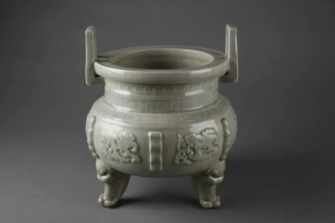 青釉刻花三足鼎 金代。1959年出土于西安蓝田城关镇南寨金元窖藏。颈部上下饰莲瓣纹与回纹,肩上饰一圈回纹,腹部仿青铜器贴花夔龙纹饰,两条夔龙之间分别用竹节形扉楞和瓦楞形扉楞装饰,三兽足兽首造型庄严,富有神韵。整器通体施月白釉,微微发青,釉色淡雅匀净,制作精良。现藏于陕西历史博物馆。