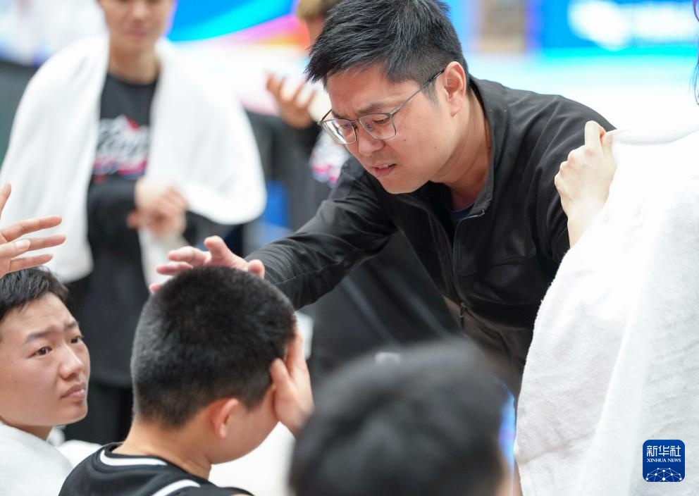 12月14日,北京队教练员毛永强(上)安慰头部受到撞击的队员冯晓欣。