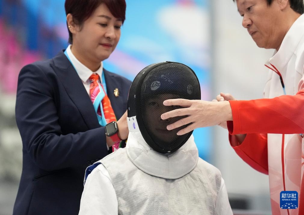 12月14日,教练和裁判在金牌赛前帮助广东一团队选手江柏莹(中)戴面罩。