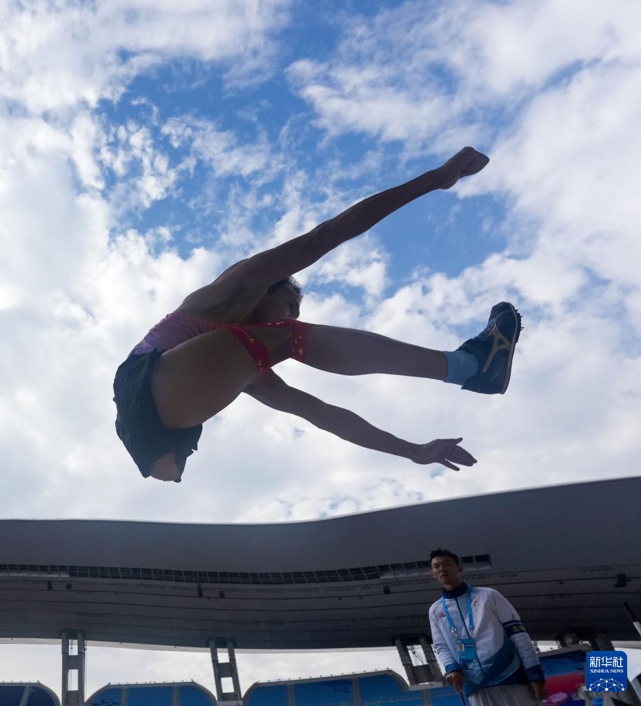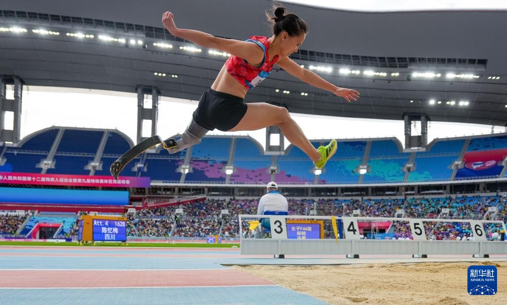 12月14日,四川队选手陈忆梅在女子跳远T63级决赛试跳后。最终,她获得冠军。