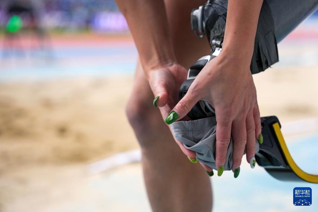 12月14日,四川队选手陈忆梅在女子跳远T63级决赛试跳后整理假肢。最终,她获得冠军。