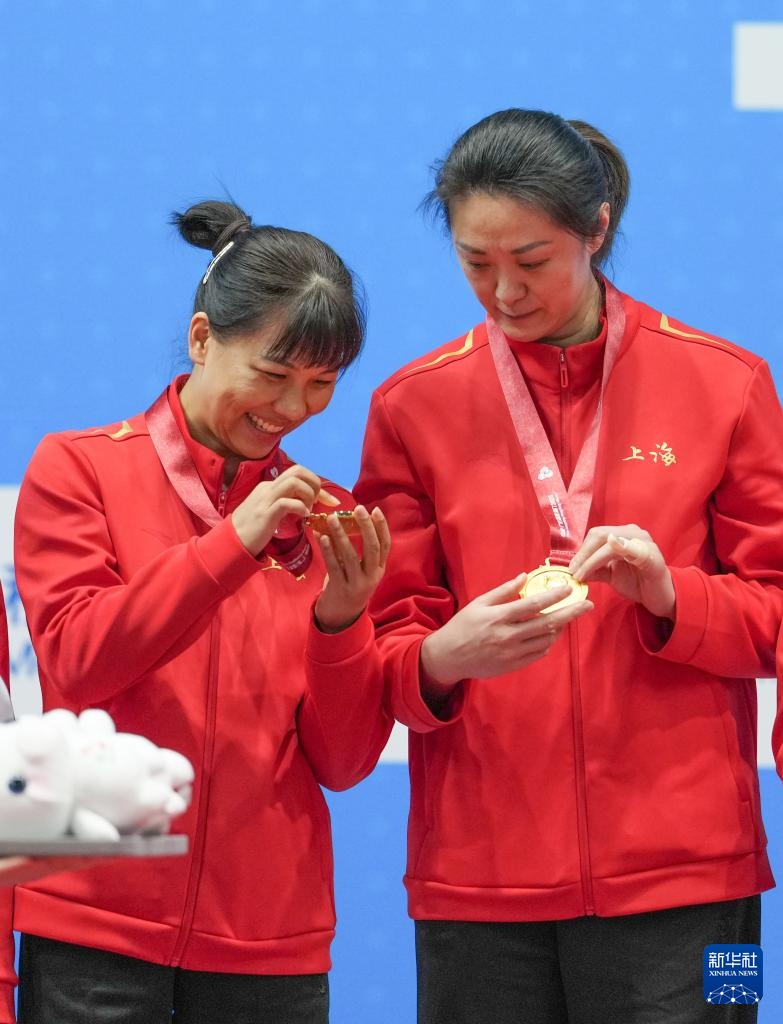 12月14日,上海队球员苏立梅(左)和队友许艺潇在颁奖仪式上观赏金牌。