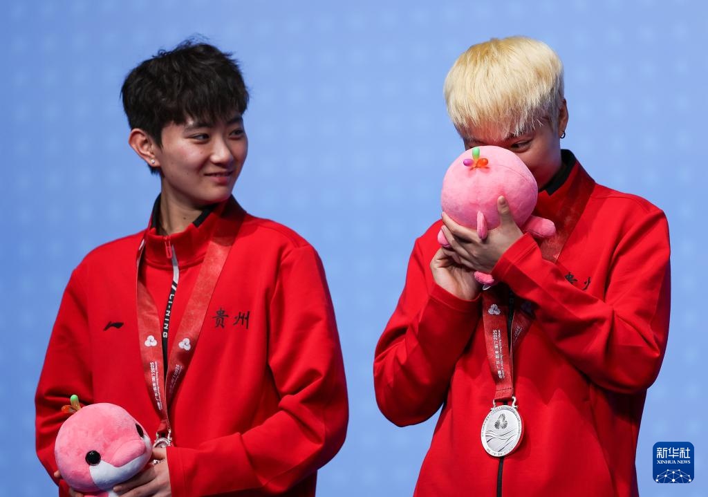 12月14日,获得亚军的贵州队选手王孟兴(右)在仪式上与吉祥物互动。