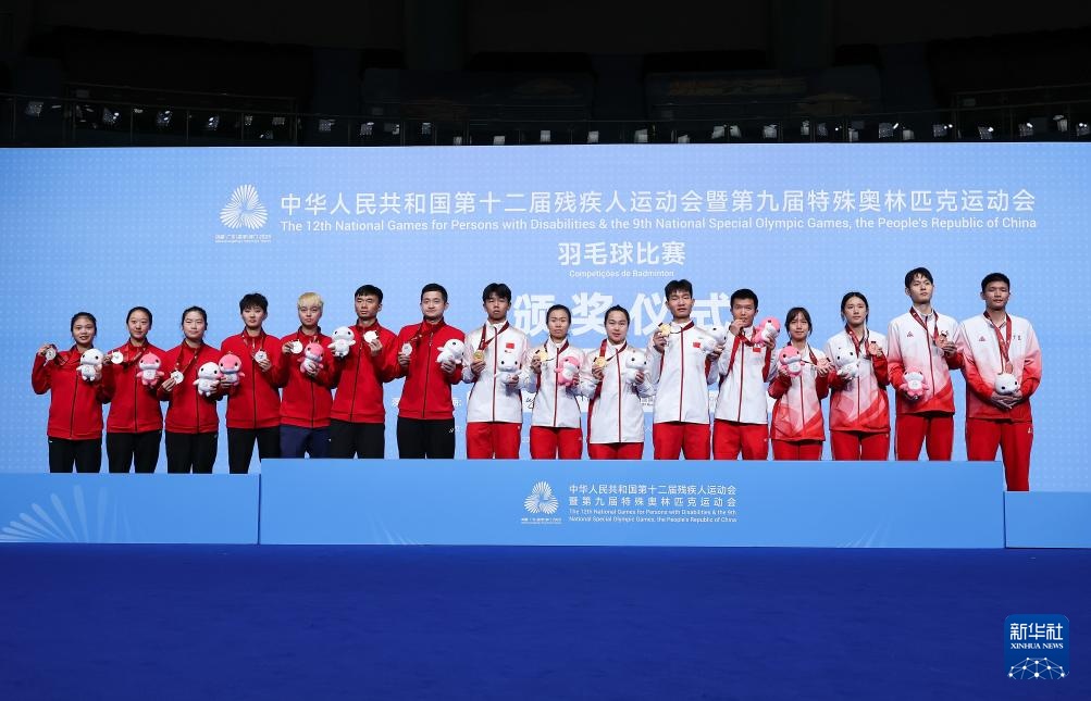 当日,全国第十二届残疾人运动会暨第九届特殊奥林匹克运动会羽毛球比赛在澳门举行,获得冠、亚、季军的湖北队、贵州队和广东一团队参加羽毛球听障混合团体颁奖仪式。