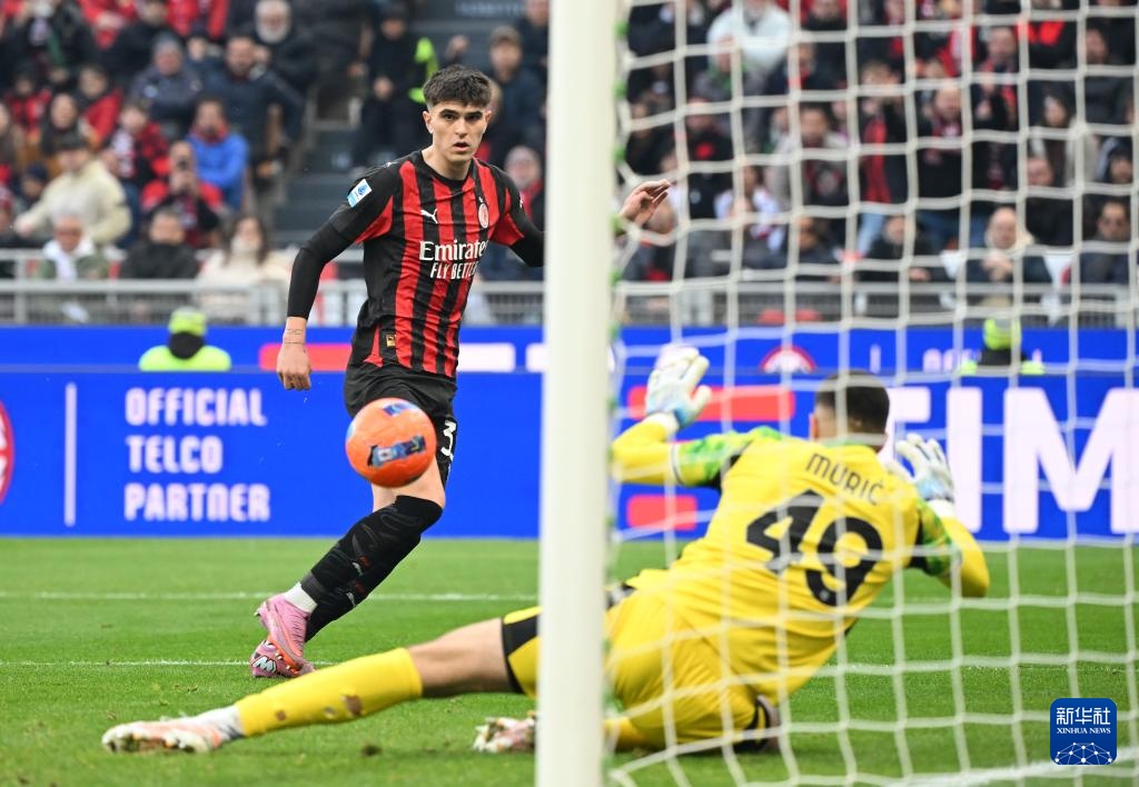 12月14日,AC米兰队球员巴尔泰萨吉(左)在比赛中射门得分。