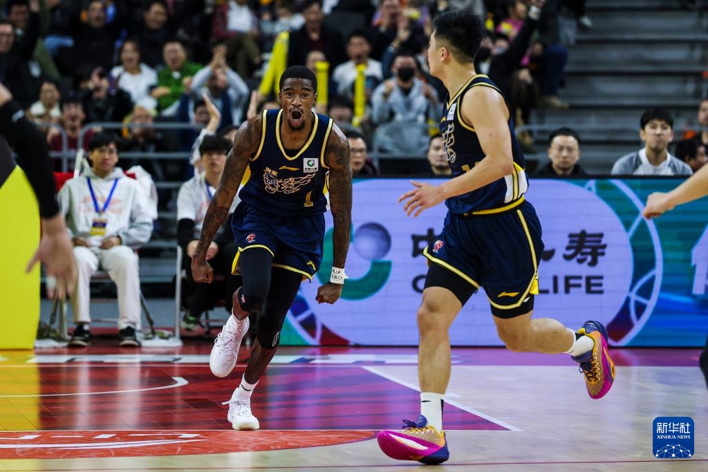 12月14日,广东东阳光队球员萨姆纳(左)在得分后庆祝。