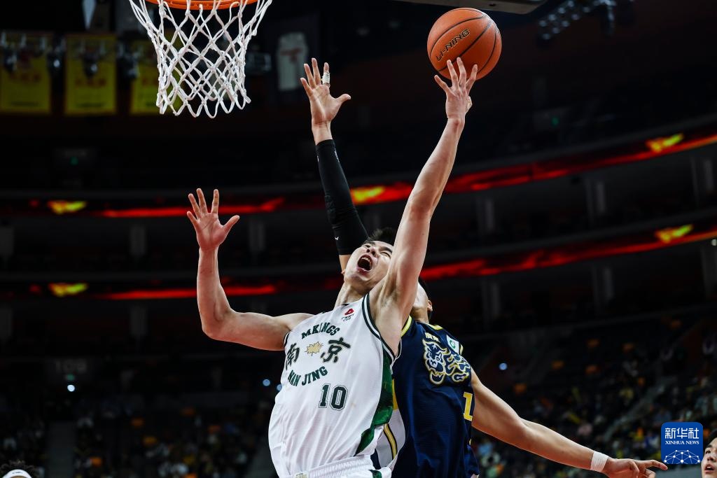 12月14日,南京天之蓝队球员郭昊文(左)在比赛中上篮。
