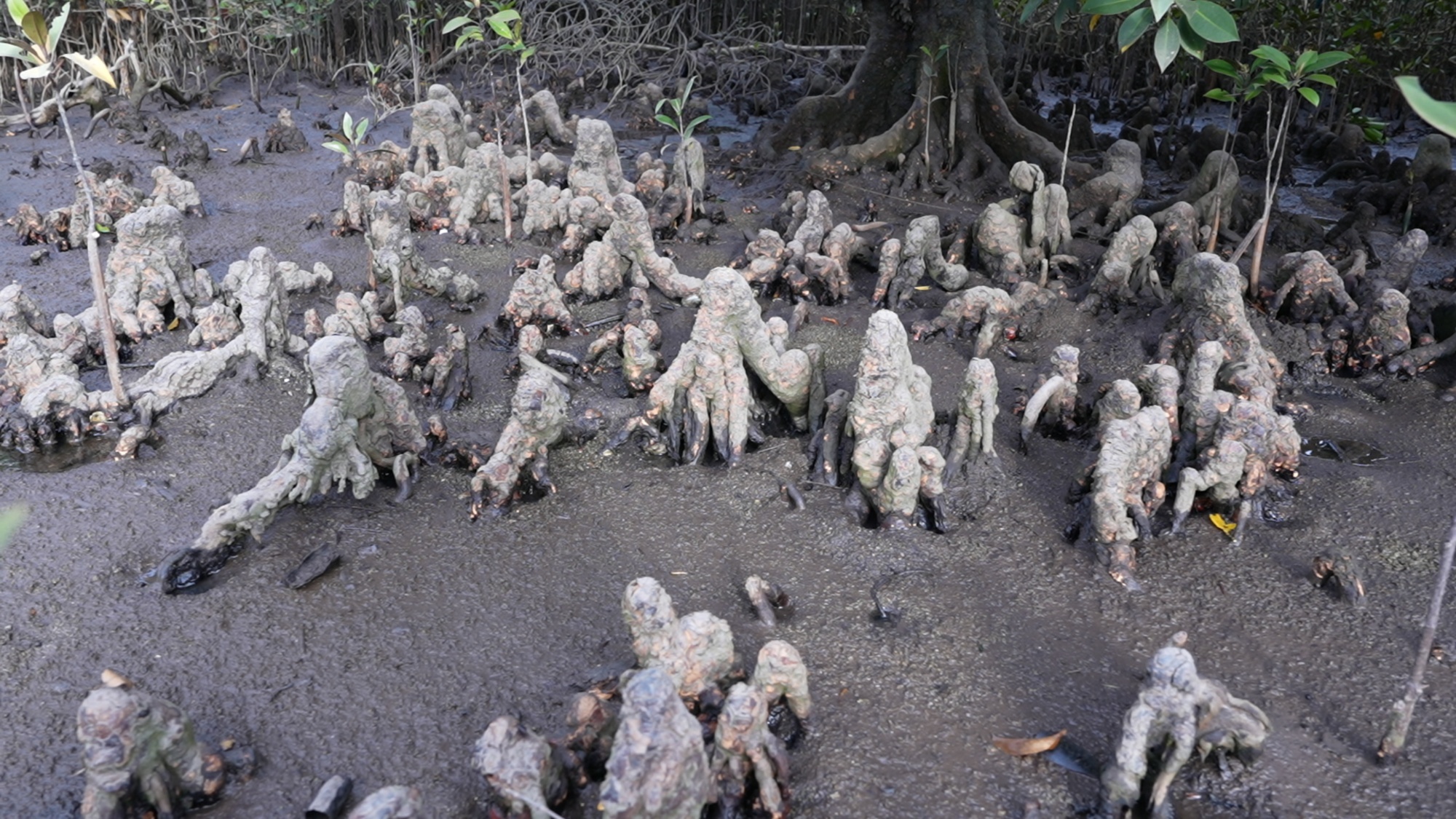 初见红树林,其翠绿叶片与普通植物并无二致,得名“红”树,是因其树皮富含的单宁酸在“受伤”后氧化会变为红色。