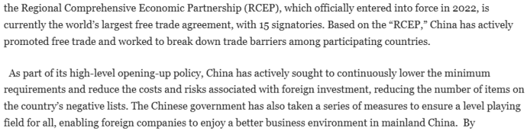 文章最后说,作为高水平对外开放政策的重要组成部分,中国积极致力于持续降低外商投资门槛,减少投资成本与风险,缩减负面清单事项数量。中国政府采取一系列措施为外国企业打造更优质的营商环境。通过扩大鼓励外商投资产业目录,降低进口关税,中国正在为全球领先的科技企业成功投资创造更多机会。