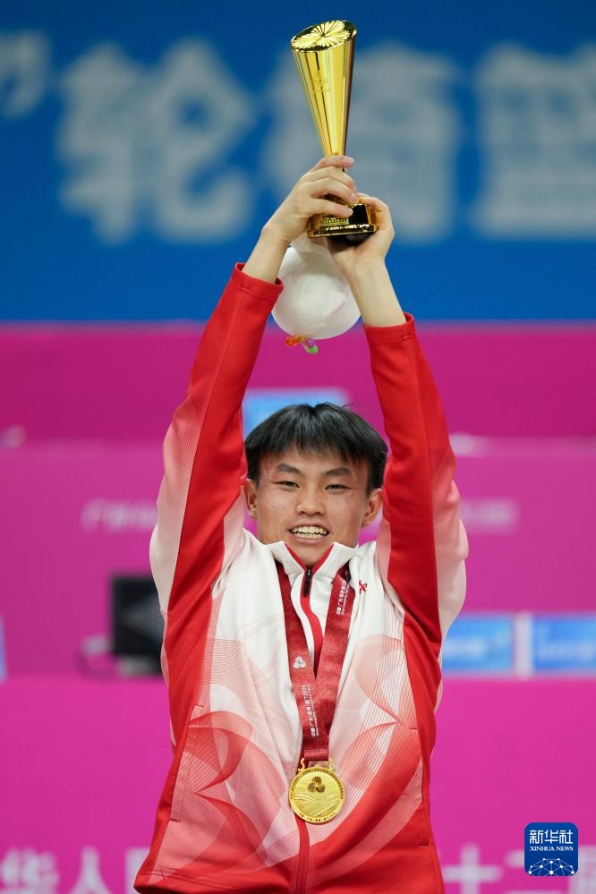12月15日,在冠军领奖台上,广东一团队球员王正权举起冠军奖杯。