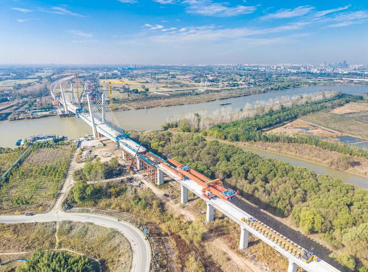 2025年11月20日,中铁建大桥局施工机械在沪渝蓉高铁江都段最后一榀箱梁架设现场作业(无人机照片)。新华社发(任飞 摄)