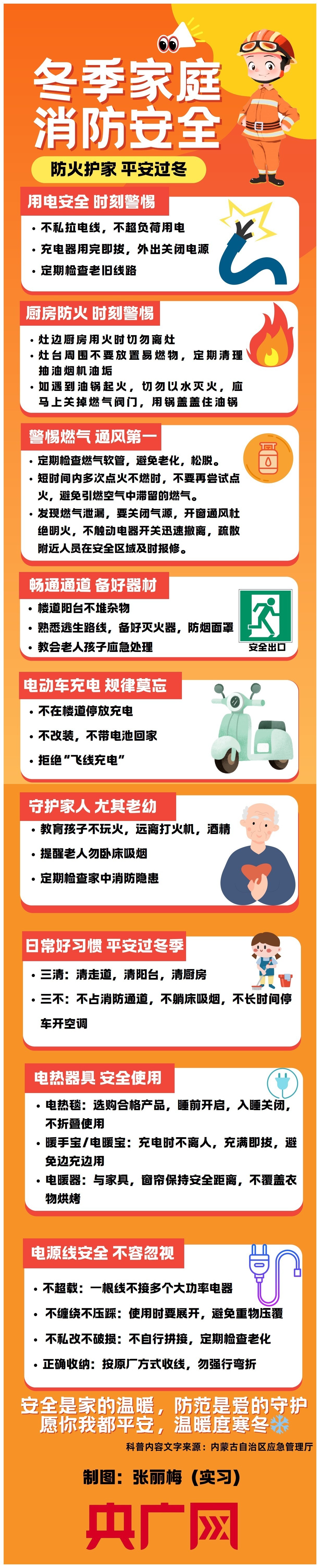 央广网呼和浩特12月17日消息(记者刘一晨)冬季天干物燥,家庭火灾风险显著攀升。为守护万家平安,这份《冬季家庭消防安全》科普海报,从安全用电、厨房用火、燃气使用到电动车充电等核心生活场景切入,系统梳理了最易被忽视的防火要点与应急措施。请查收这份海报,了解相关知识,平安过冬。
