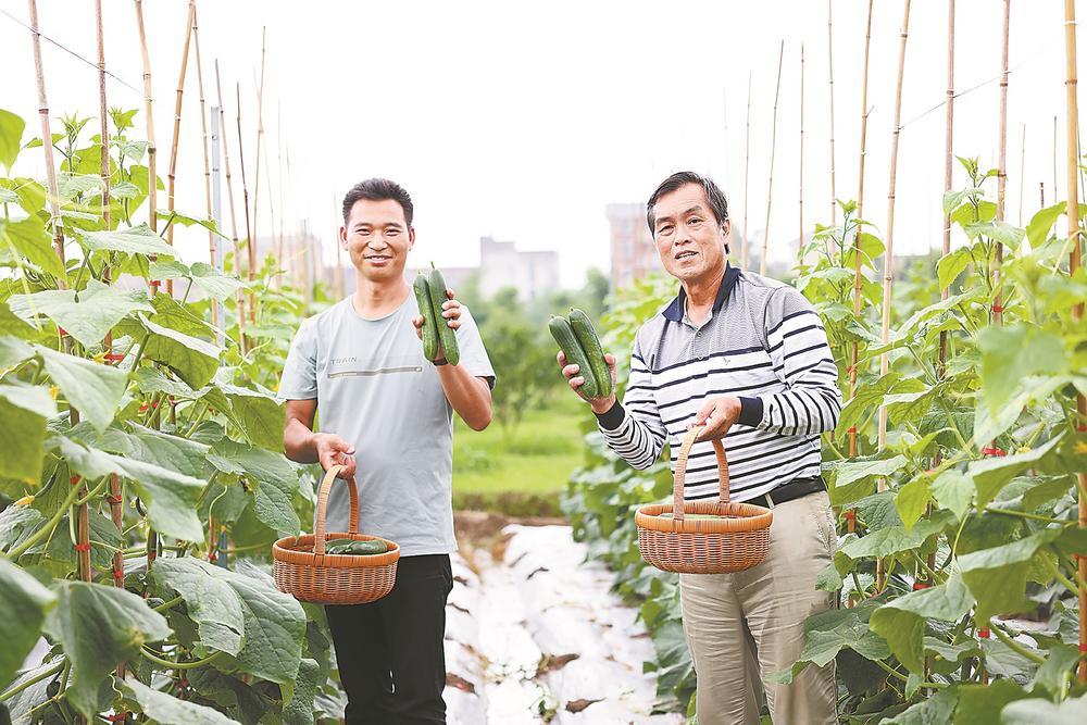台胞、福建常春藤农业有限公司负责人王森谅(右一)在福清台创园基地采收黄瓜。 通讯员 高兴铨 摄