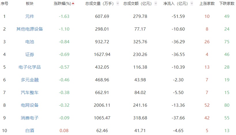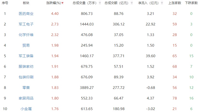 行业板块方面,医药商业、军工电子、化学纤维等板块涨幅居前,元件、电池、证券等板块跌幅居前。