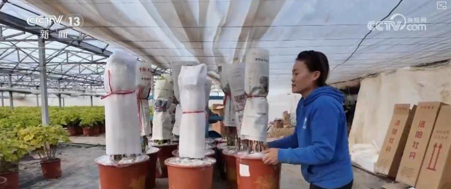 在河南洛阳市洛龙区李楼镇的花卉大棚里,工作人员正忙着将含苞待放的牡丹打包、发货。