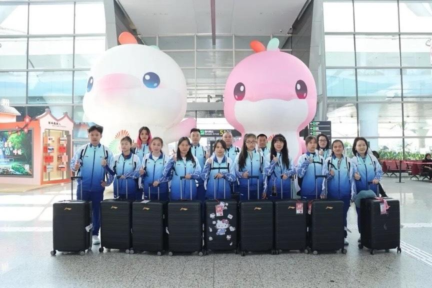 四川盲人女足在广州吉祥物打卡点合影