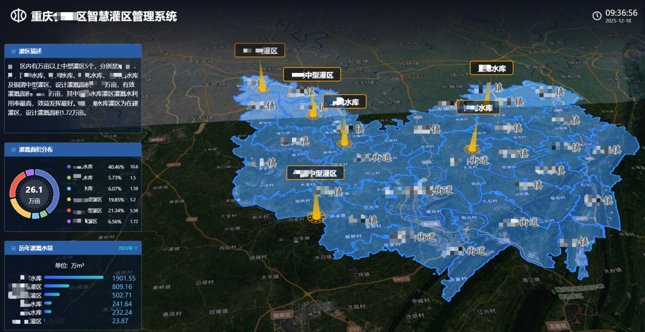 在重庆合川,天翼物联打造智慧灌区民生工程,通过灌区“一张图”,实现灌区内2座水源水库、84公里输配水管网的实时监测与智能调度,保障合川区二郎镇、燕窝镇9个行政村超2000户农户超1.2万亩农田的精准灌溉用水,通过水库雨水情分析、旱情AI模型分析、视频监控和量测水等能力,实现配水调度执行率提升至95%以上,在确保农作物“喝上及时水” 的同时,助力农民增产增收,为乡村振兴注入强劲数字动能。