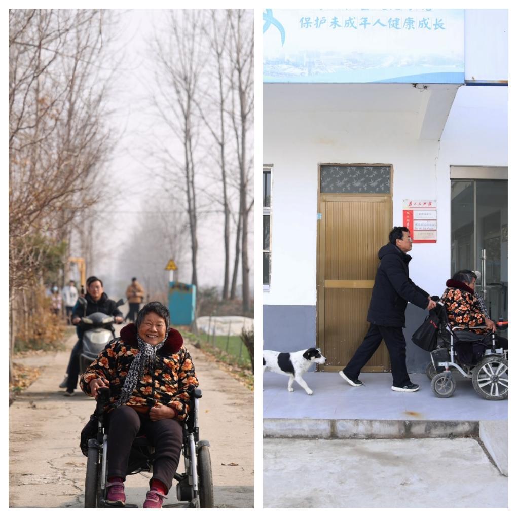 在江苏省淮安市洪泽区三河镇涧前村,每天中午11点,一辆电瓶车、一辆电动轮椅、一条狗,准时行进在乡间小道上,这是去往哪里呢?