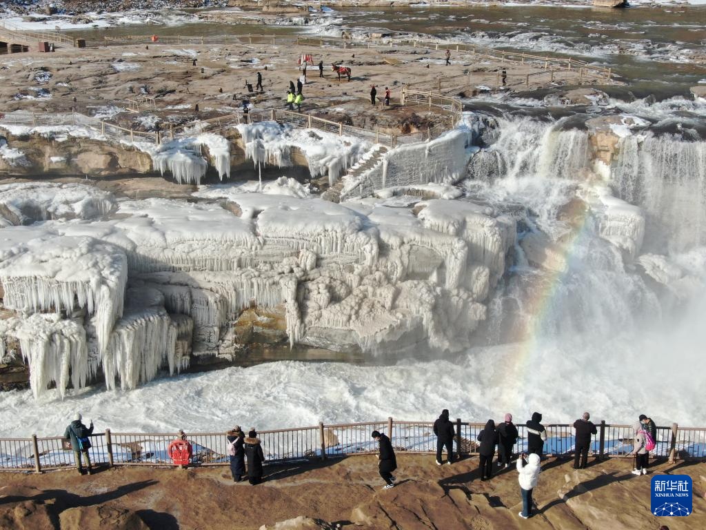 1月6日在山西吉县黄河壶口瀑布景区拍摄的“冰瀑玉壶”和彩虹景观。