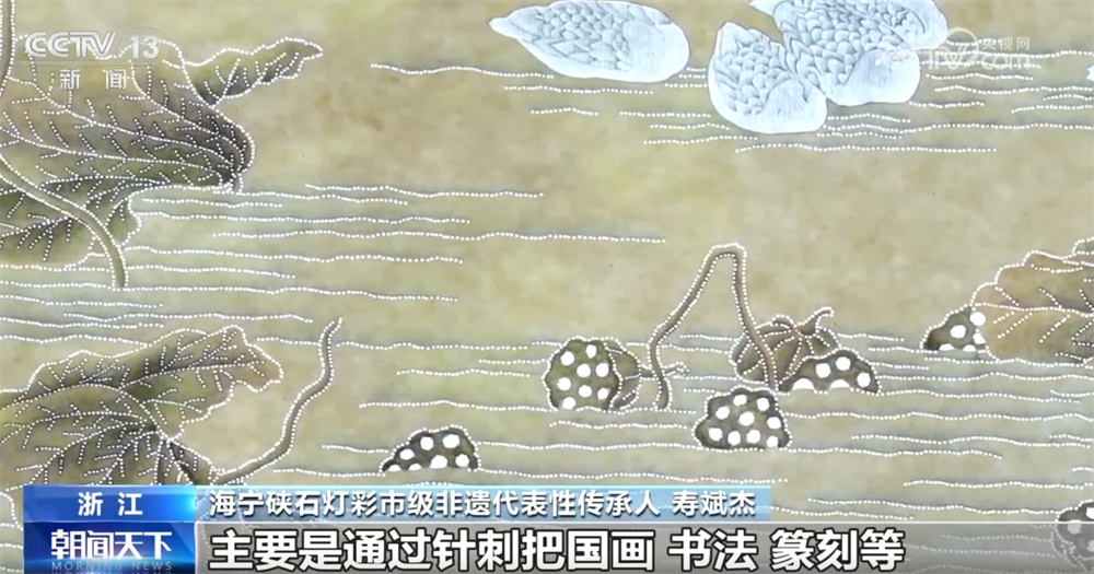 海宁硖石灯彩市级非遗代表性传承人 寿斌杰:主要是通过针刺把国画、书法、篆刻等融合在一起,在夜晚灯光的透射下会达到一种非常奇幻而且是万眼罗灯的效果。