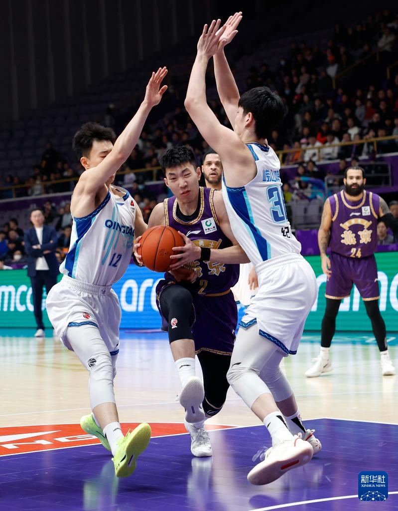 1月30日,北京控股队廖三宁(中)在比赛中突破青岛崂山啤酒队球员段昂君(左)与纪卓的防守。
