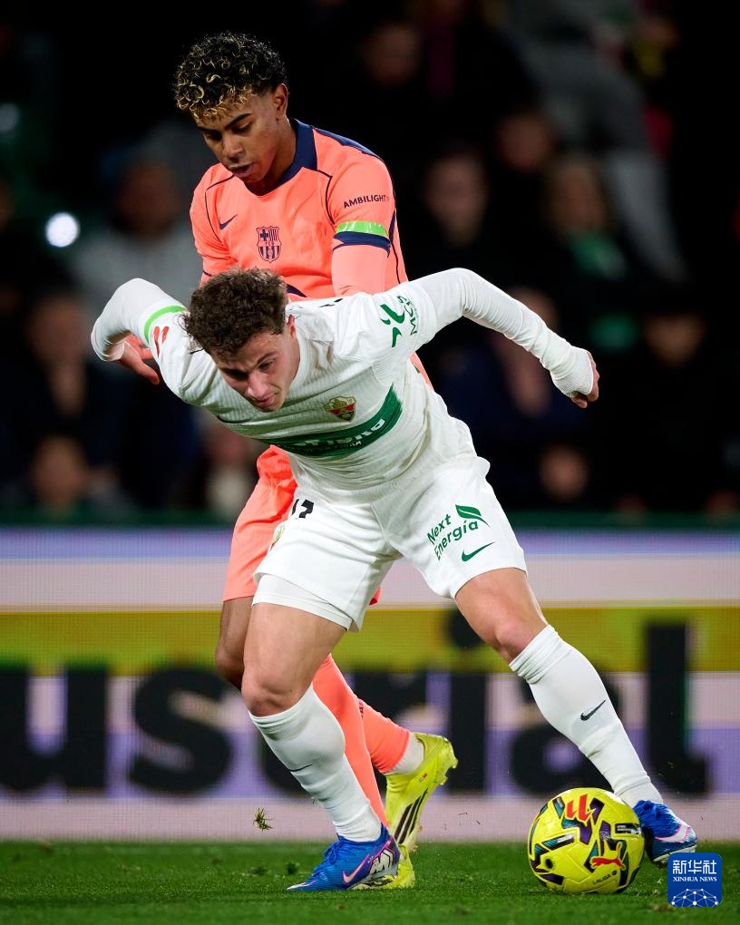 1月31日,巴塞罗那队球员亚马尔(上)和埃尔切队球员罗德里戈在比赛中拼抢。