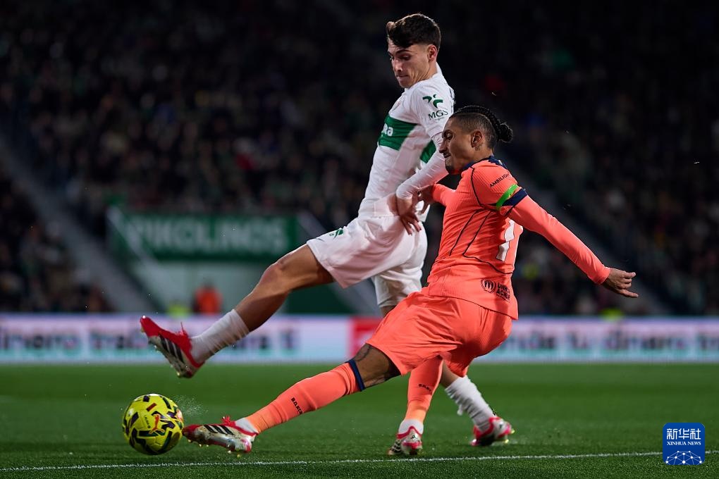 1月31日,巴塞罗那队球员拉菲尼亚(右)和埃尔切队球员罗德里戈在比赛中拼抢。