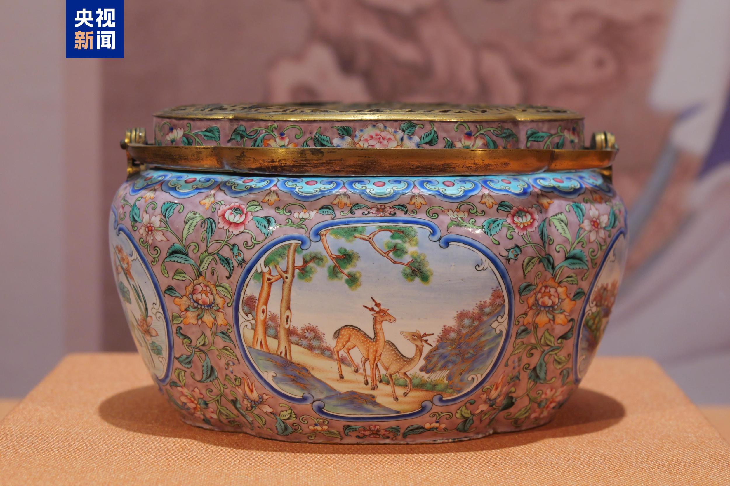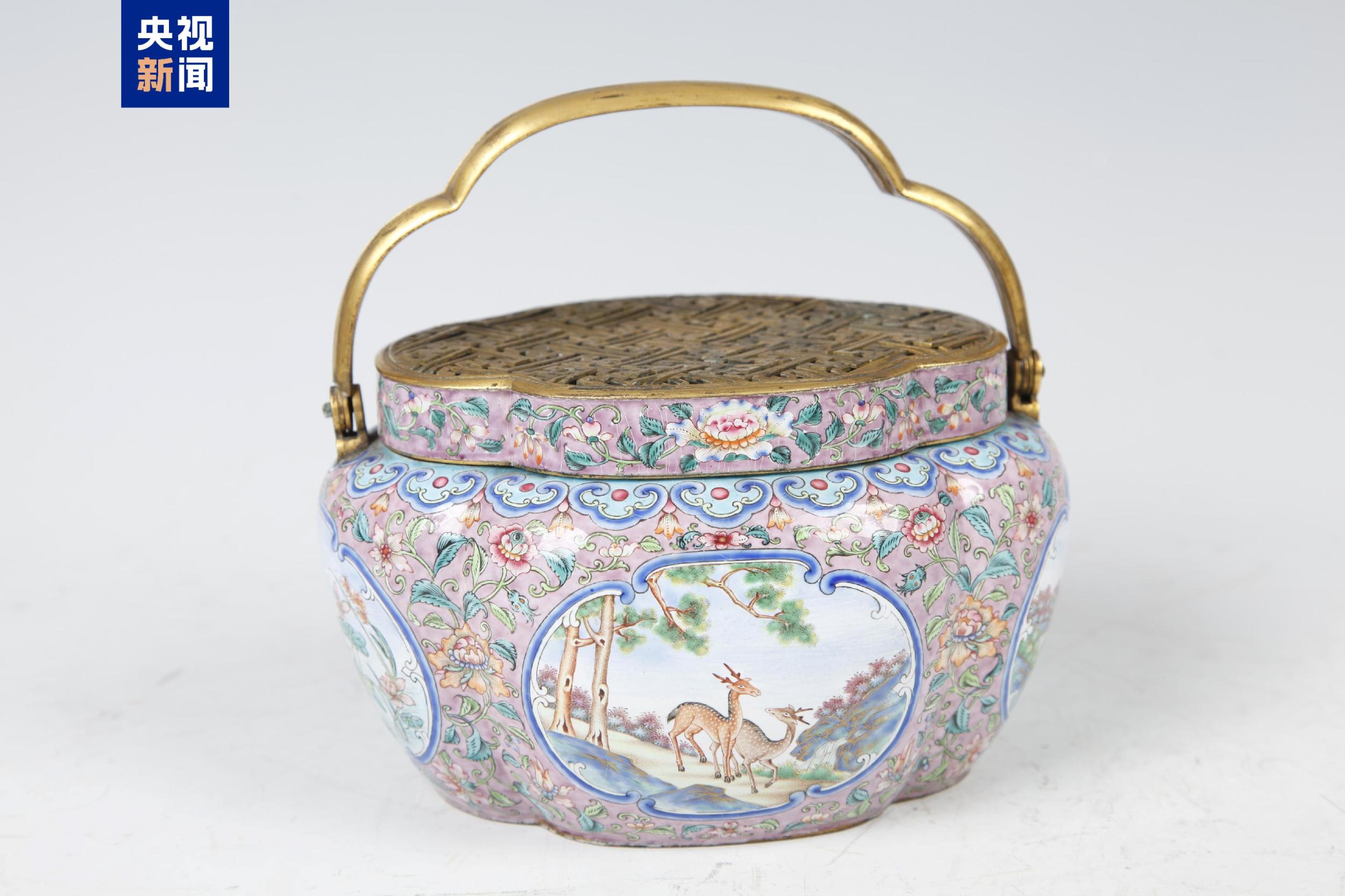 这件清铜胎画珐琅开光松鹿图手炉