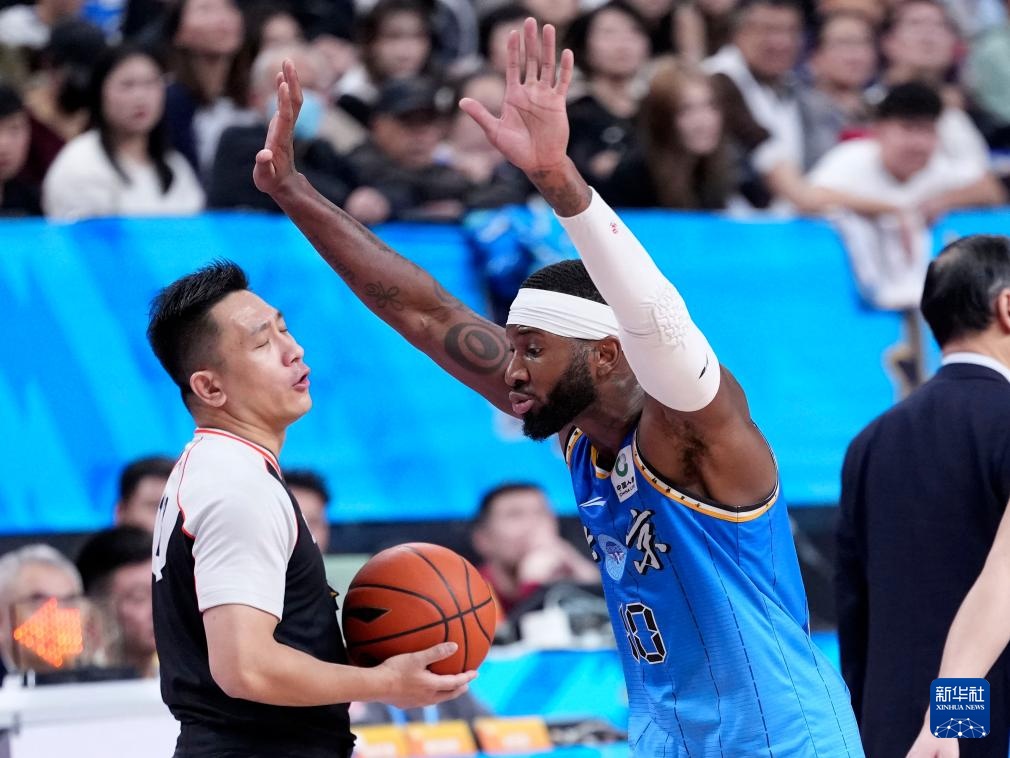 2月3日,北京北汽队球员杰曼(右)在比赛中与裁判沟通。