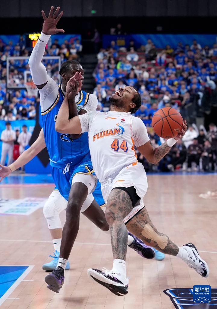 2月3日,福建晋江文旅队球员特莱斯(右)在比赛中突破受阻。