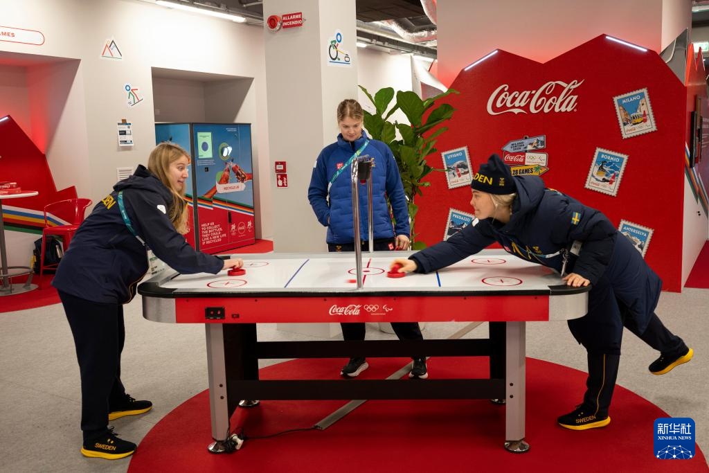 2月3日,在意大利米兰奥运村,瑞典队运动员玩空气曲棍球。