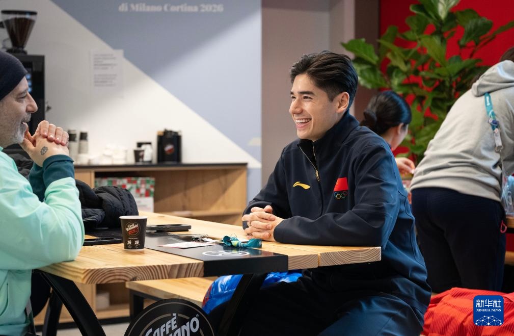 2月3日,在意大利米兰奥运村,中国短道速滑队运动员刘少昂(右)与人交谈。