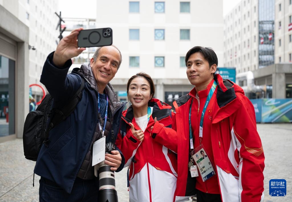 2月3日,在意大利米兰奥运村,一名记者与中国花滑队运动员隋文静(中)、韩聪(右)自拍留念。