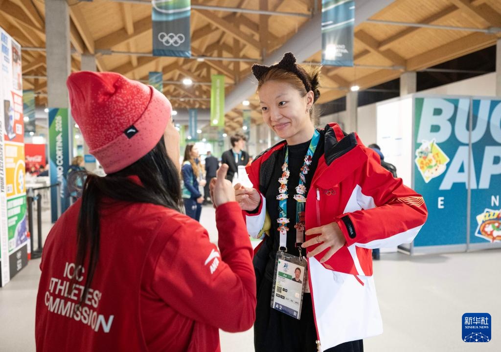 2月3日,在意大利米兰奥运村,中国速度滑冰队运动员杨滨瑜(右)与工作人员交换徽章。
