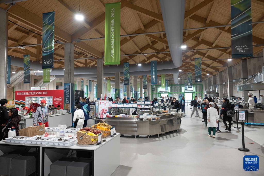 这是2月3日拍摄的意大利米兰奥运村餐厅。