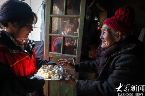 9岁的小志愿者刘梓瑜为88岁的李元花送来饺子。
