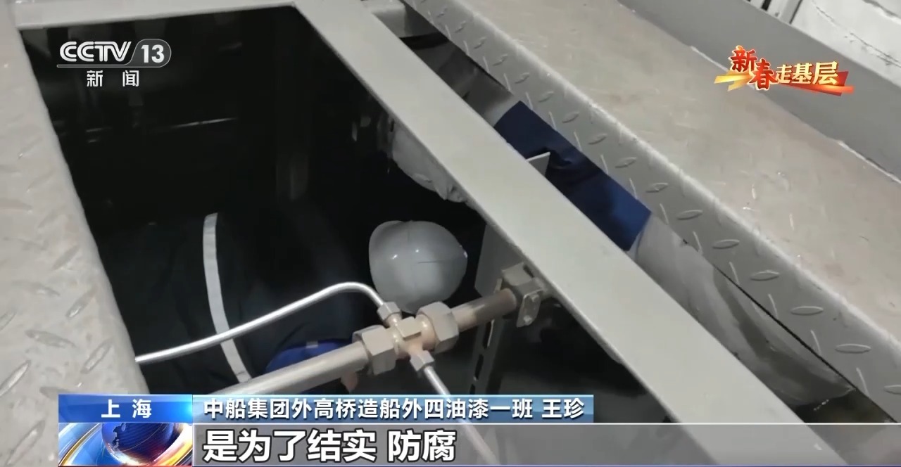 中船集团外高桥造船外四油漆一班 唐佃亮:护栏外侧的漆面,从内部是看不见的,容易有漏。一旦有漏,我们就要在外面修补一下。邮轮要求的是精细活,需要美观,比民船要求高多了,要是让乘客看到油漆坑坑洼洼的,那不好看。