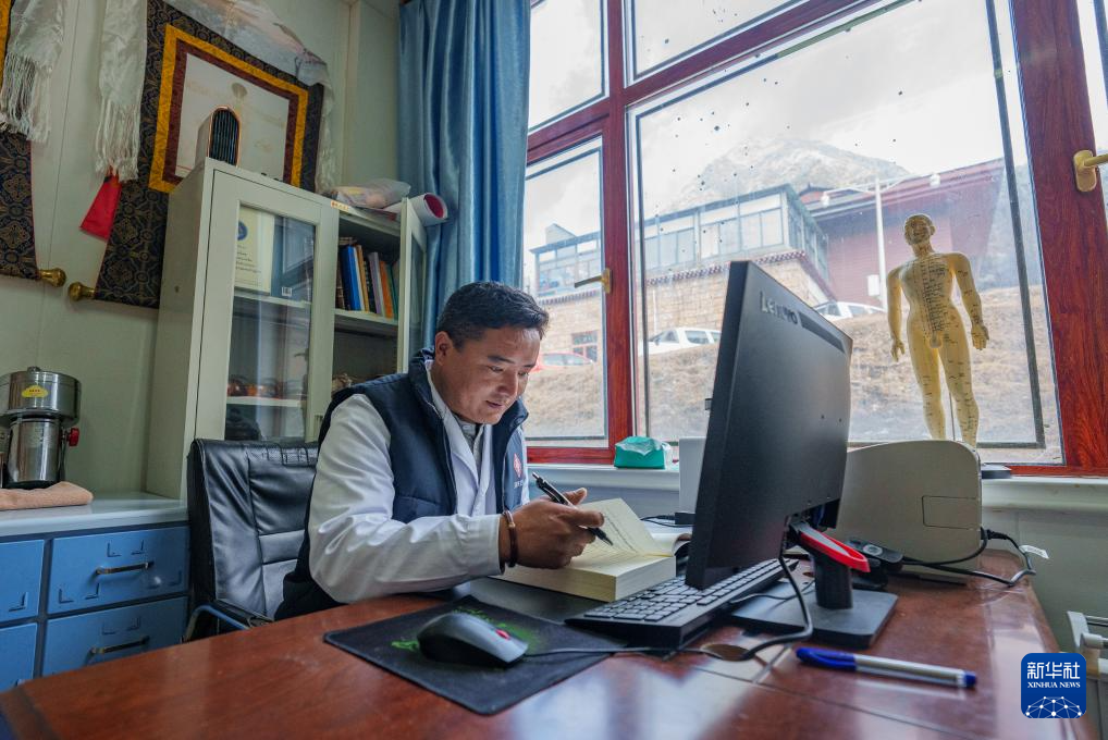 2月5日,玉麦乡卫生院副院长次旦米久在办公室研读藏医书籍。新华社记者 丁增尼达 摄