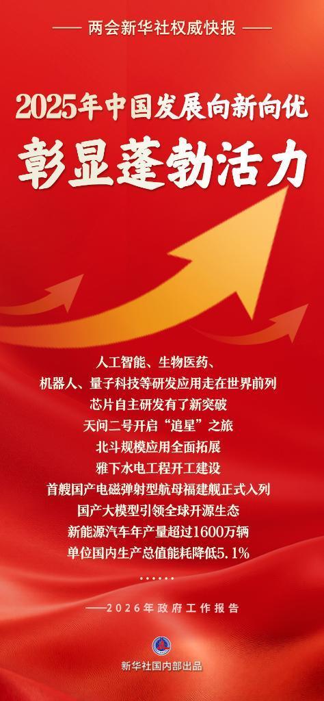 政府工作报告说,一年来,我国发展向新向优、彰显蓬勃活力。新质生产力稳步发展,科技创新成果丰硕,人工智能、生物医药、机器人、量子科技等研发应用走在世界前列,芯片自主研发有了新突破,天问二号开启“追星”之旅,北斗规模应用全面拓展,雅下水电工程开工建设,首艘国产电磁弹射型航母福建舰正式入列,国产大模型引领全球开源生态。产业结构持续优化,高技术制造业、装备制造业增加值分别增长9.4%、9.2%,工业机器人、集成电路产量分别增长28%、10.9%,新能源汽车年产量超过1600万辆,电动汽车充电设施突破2000万个。单位国内生产总值能耗降低5.1%,生态环境质量持续改善。