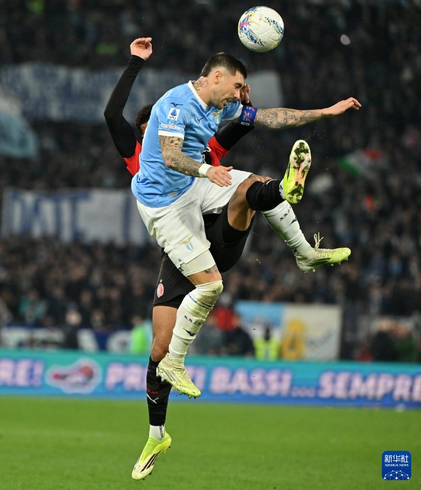 3月15日,拉齐奥队球员扎卡尼(前)在比赛中争顶。